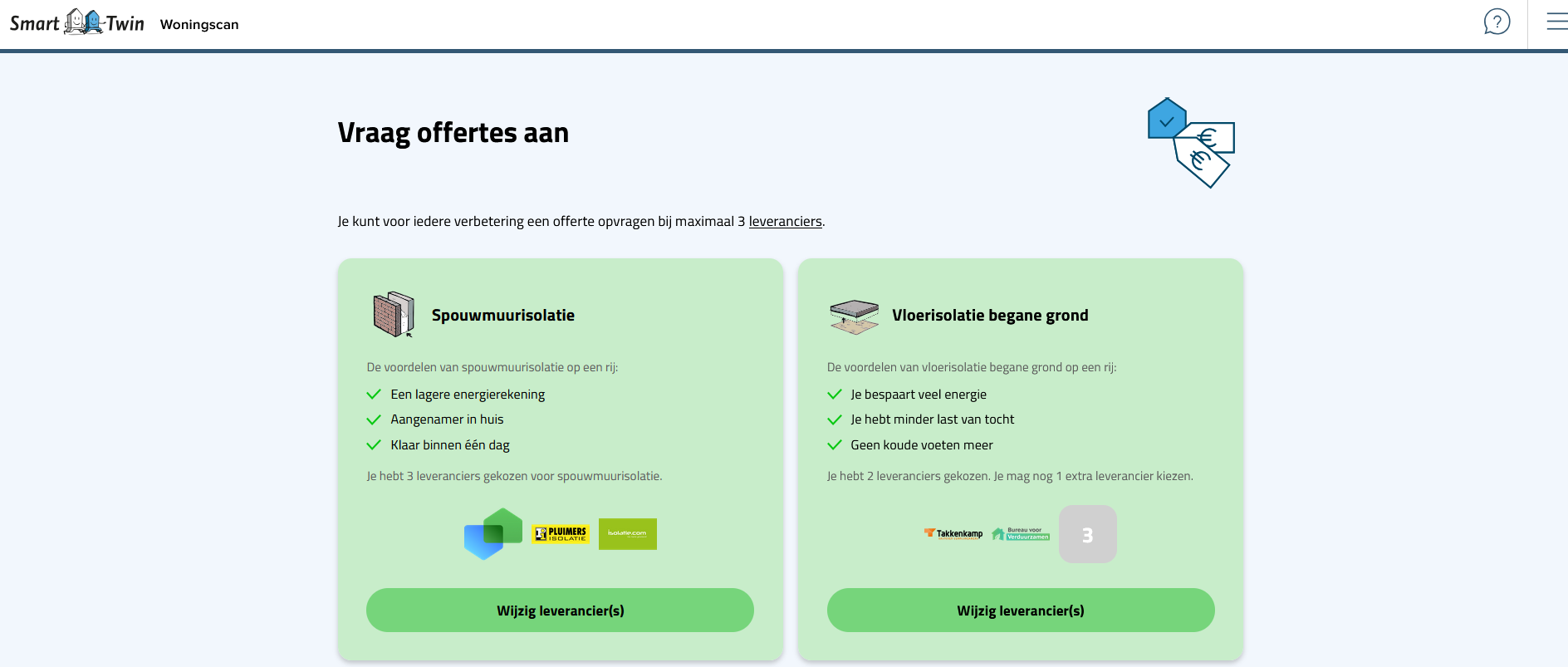 Ben je installateur van verduurzamingsmaterialen, zoals isolatiematerialen, beglazing of duurzame apparaten als zonnepanelen, of warmtepompen? Door je dienstverlening/expertise te vermelden op Smart Twin word je zichtbaar voor woningeigenaren - landelijk of in je eigen regio - die hun woning willen verduurzamen.